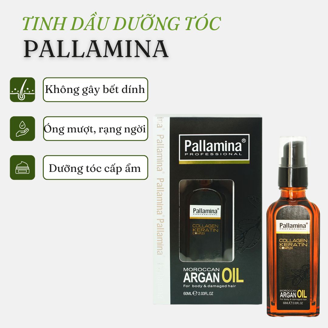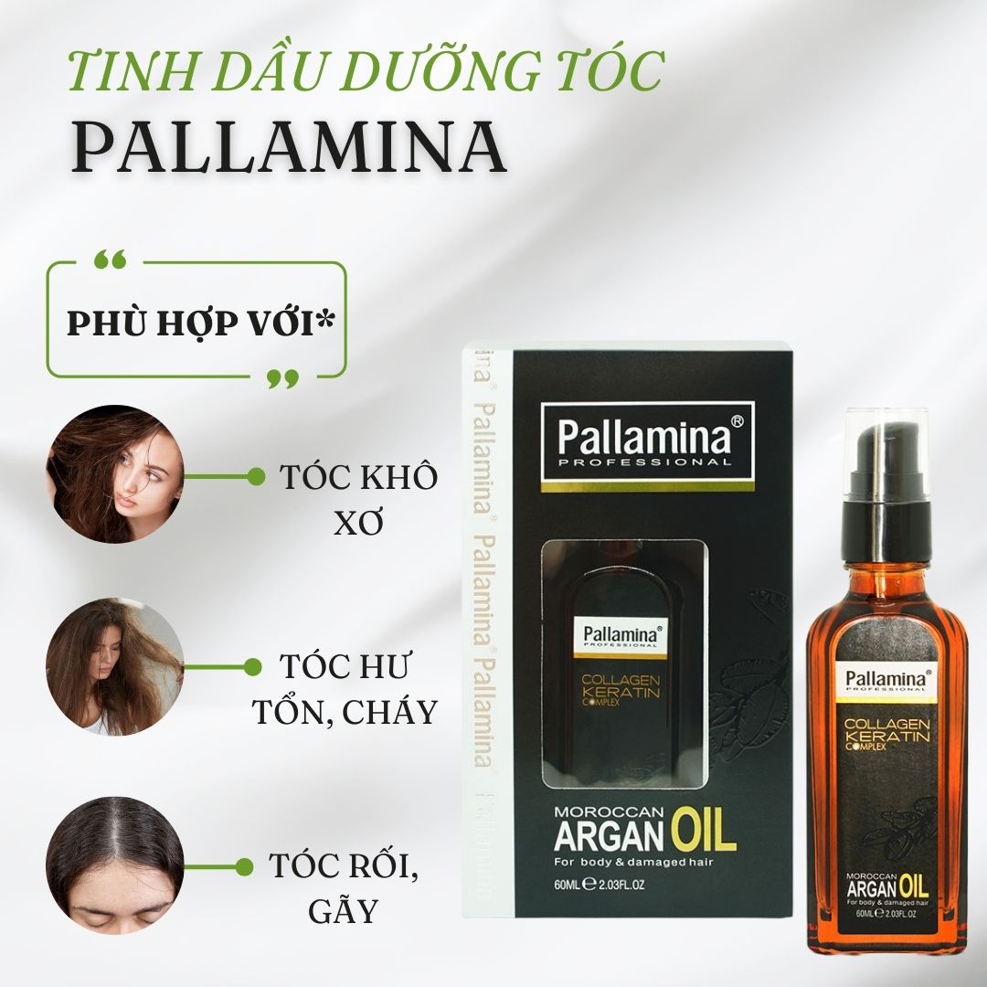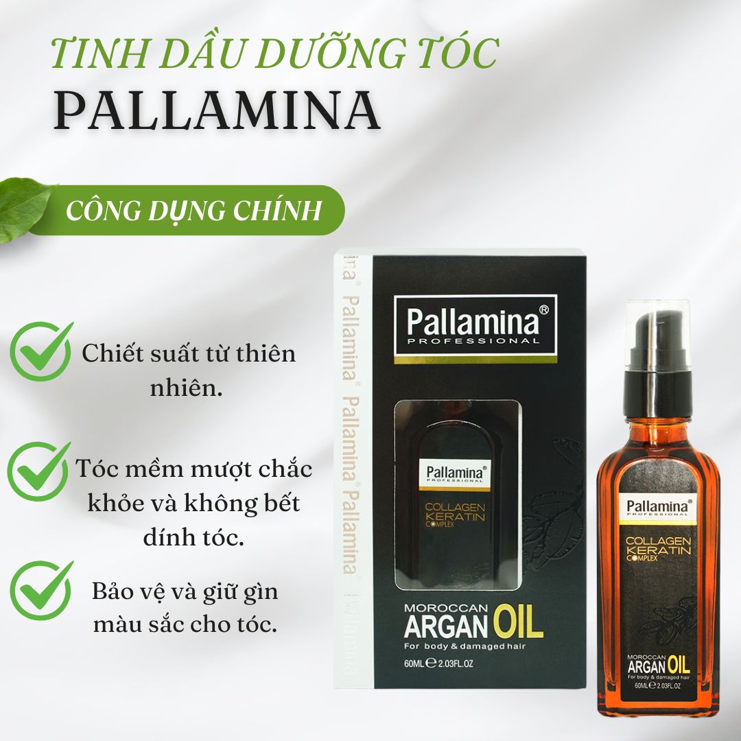 - Tinh dầu Pallamina dành cho tóc đã qua hóa chất uốn duỗi nhuộm dẫn đến hư hại tóc. Với thành phần tinh dầu Argan giúp phục hồi tóc hiệu quả, kết hợp với tinh chất collagen và keratin giúp tóc bóng mượt và chắc khỏe.